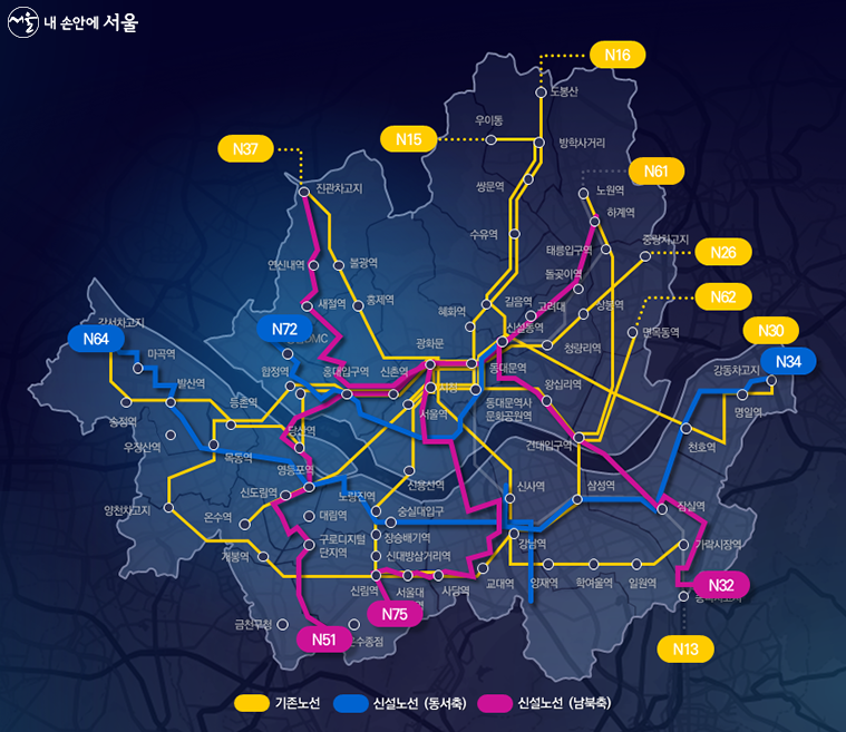 서울과 수도권에는 심야 버스가 운영 중입니다. 택시가 안 잡힐 때는 버스+택시 조합으로 동선을 나눠 귀가하면 훨씬 효율적입니다.